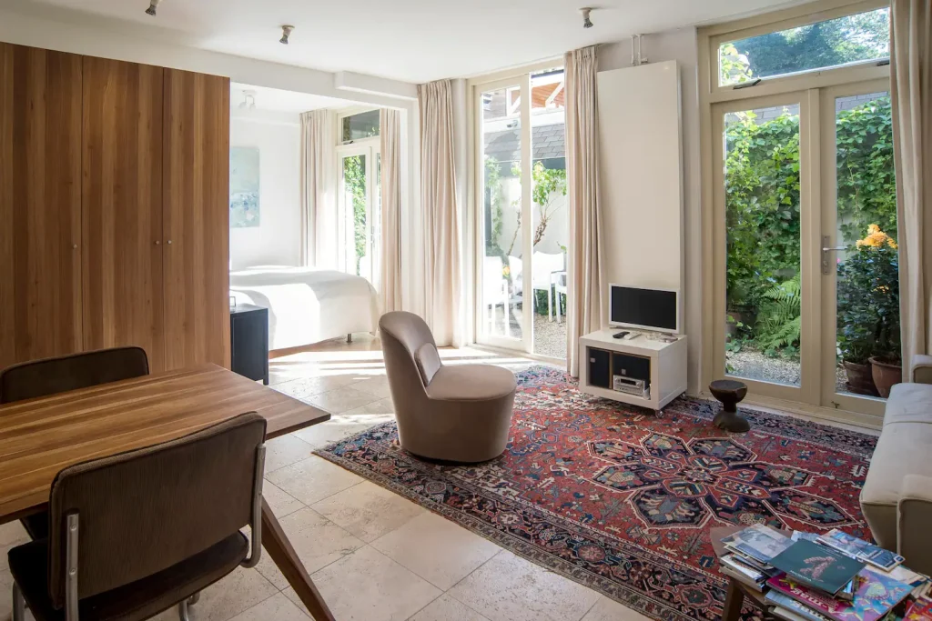 This is a very privat ground floor studioapartment (so no steep stairs) with your own privatgarden , in the peaceful so called backhouse of our canalhouse at the Amstel river. extremely central yet very quiet. A privat marble bathroom/ toillet, privat kitchen+ privat (Miele) washingmachine / dryer(etc.).2 minutes away from Central Station( subway), 9 minutes from World Trade center(subway). The subway entrance is 2 minutes