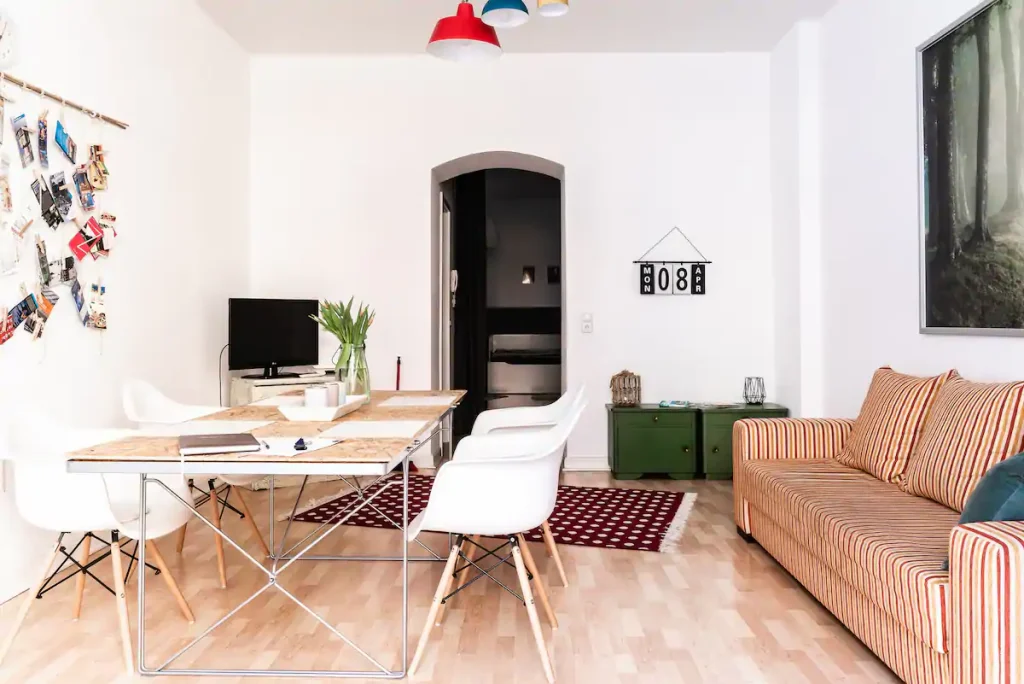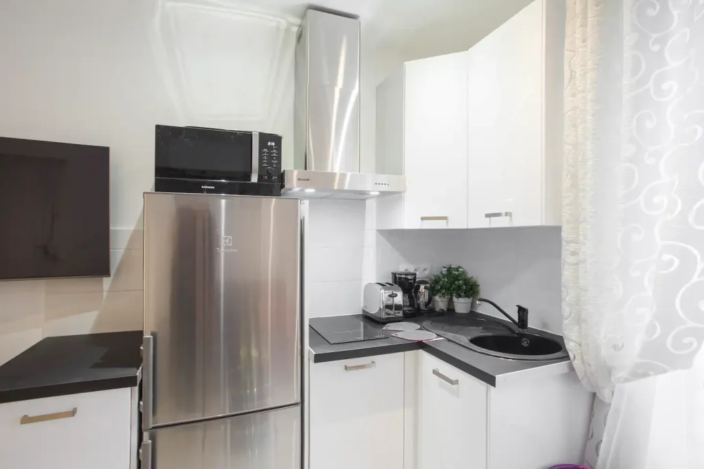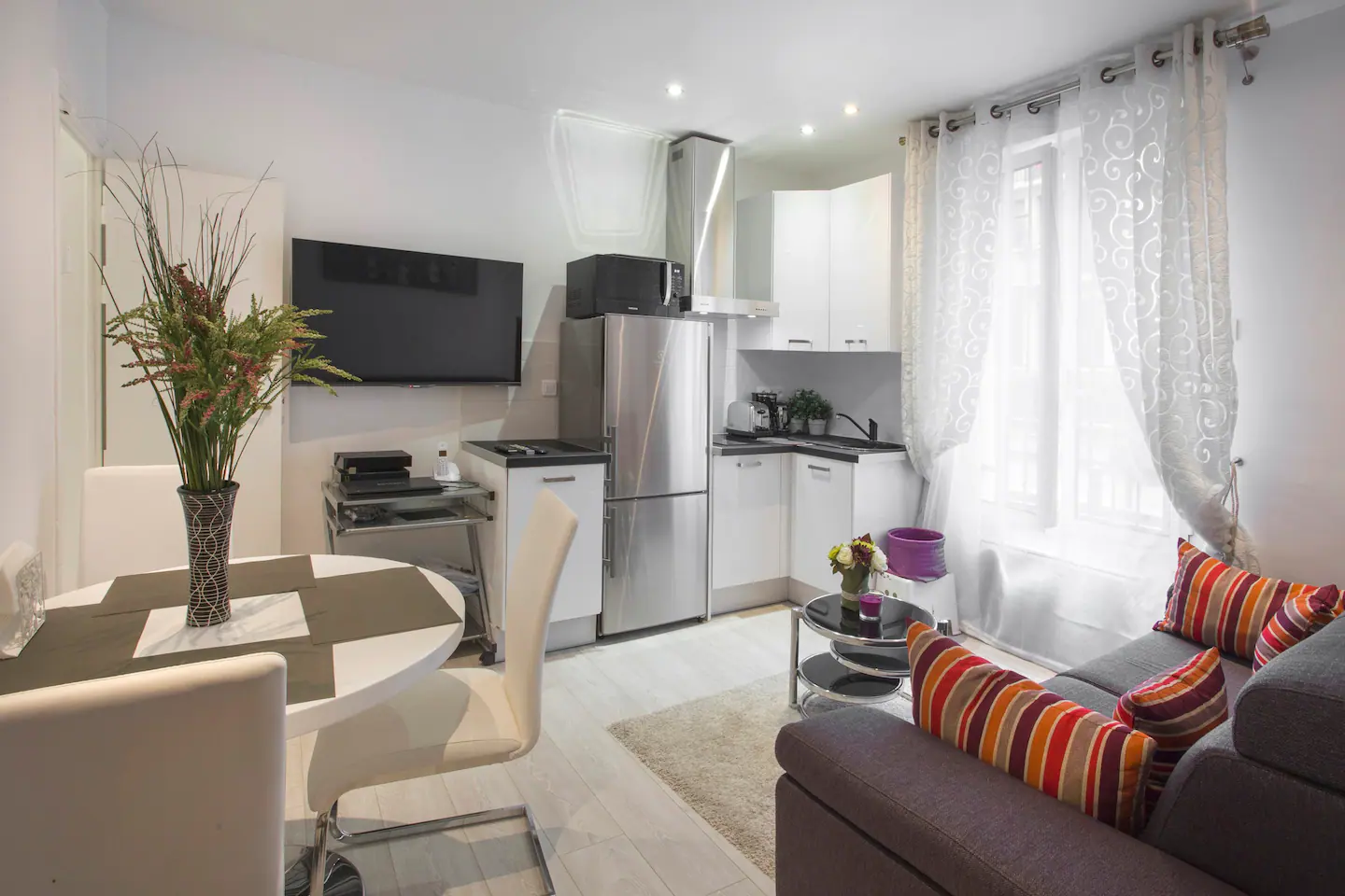 First you will find a comfortable sofa that can be converted into a double bed if necessary, then a round table with 4 chairs,you can also enjoy good moments of relaxation in front of a flat-screen TV with satellite and cable. A good breakfast with fresh croissants from the local baker, there you will really feel in Paris.